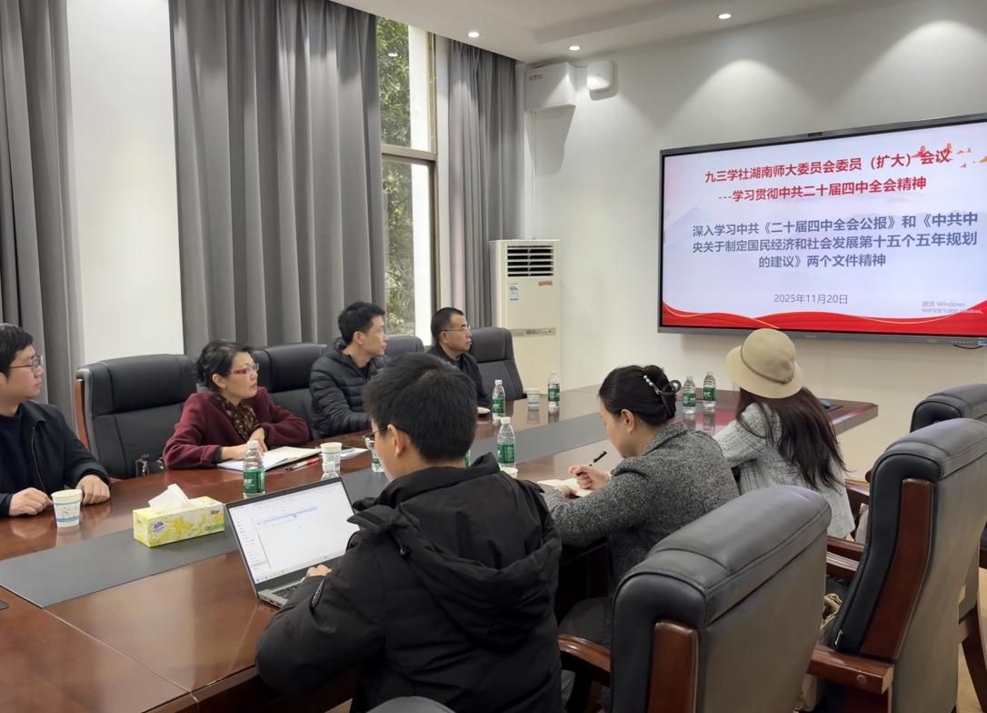 11月20日上午,九三学社湖南师范大学委员会在地科院会议室召开委员(扩大)会议,深入学习《中国共产党第二十届中央委员会第四次全体会议公报》和《中共中央关于制定国民经济和社会发展第十五个五年规划的建议》两个文件精神。会议由九三学社湖南师范大学委员会主委唐承丽主持,在校委员会成员及各支社部分社员代表出席会议。