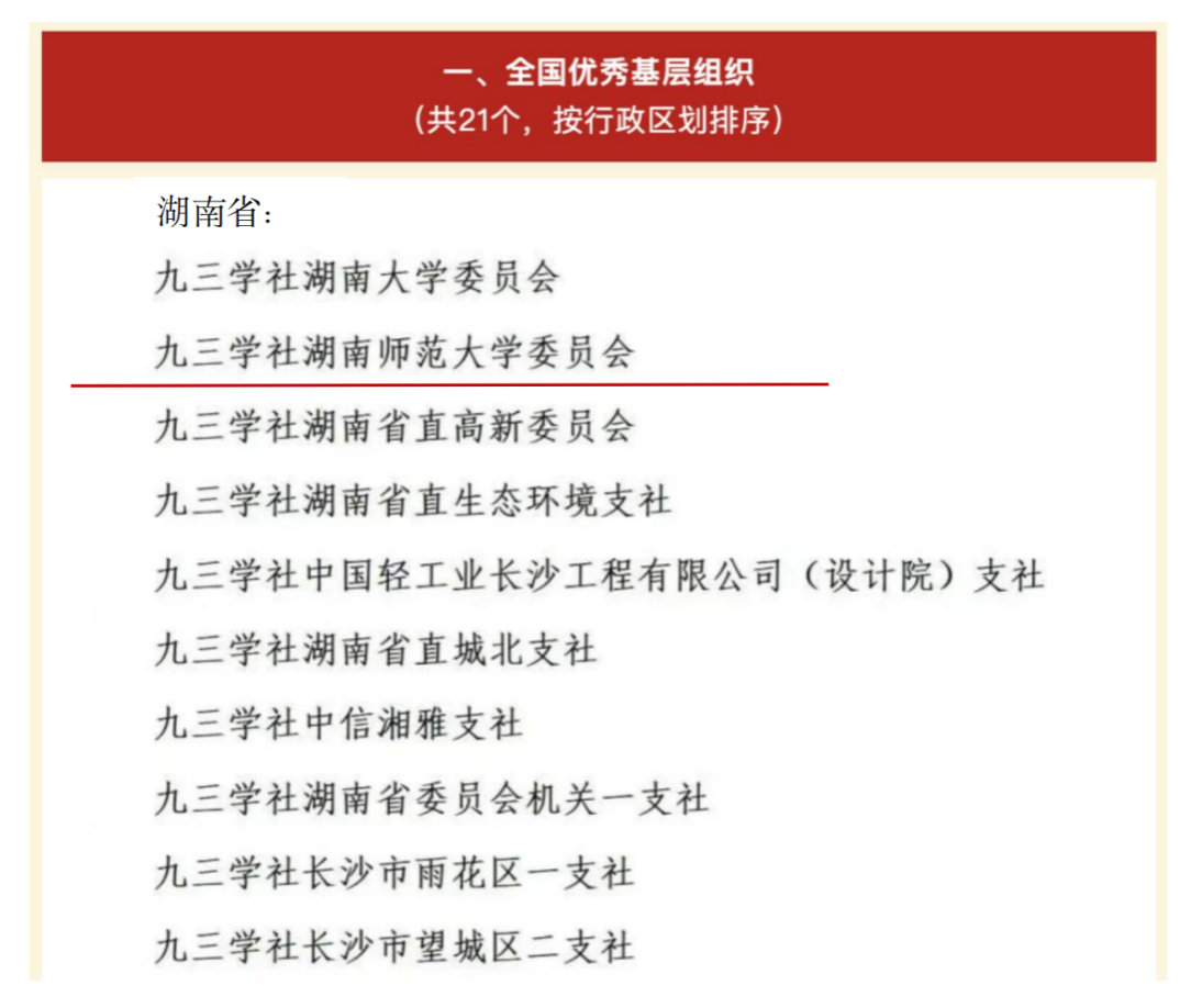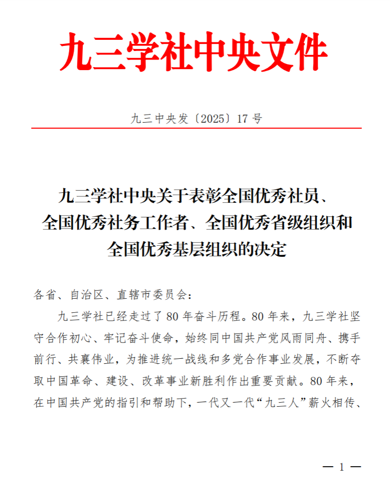在庆祝九三学社创建80周年之际,为表彰先进典型、弘扬优良传统,激励广大社员及各级社组织积极投身中国特色社会主义事业建设,九三学社中央于近日发布《九三学社中央关于表彰全国优秀社员、全国优秀社务工作者、全国优秀省级组织和全国优秀基层组织的决定》(九三中央发〔2025〕17号)。其中,九三学社湖南师范大学委员会荣获“全国优秀基层组织”称号,委员会主委唐承丽教授获评“全国优秀社务工作者”。